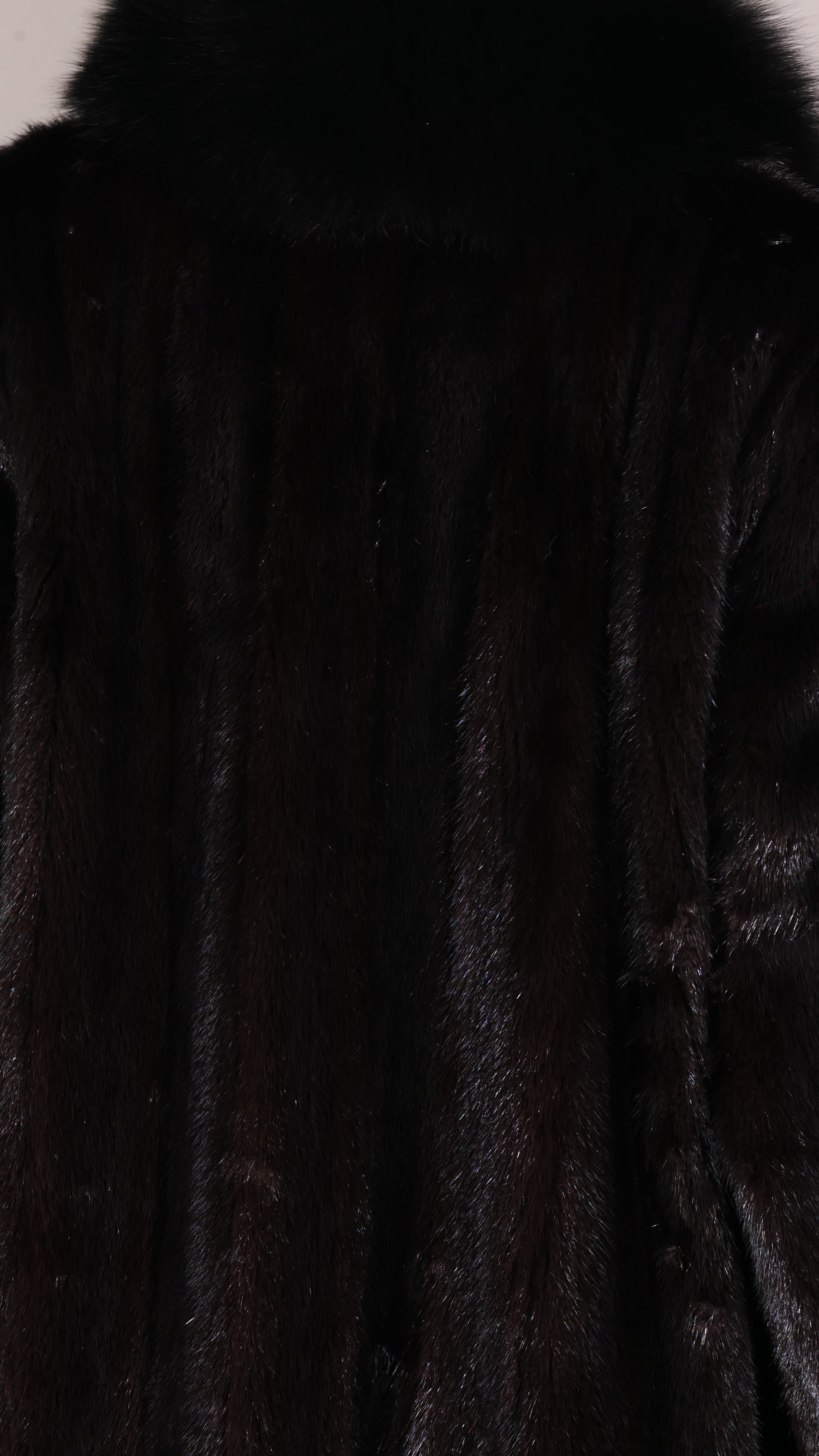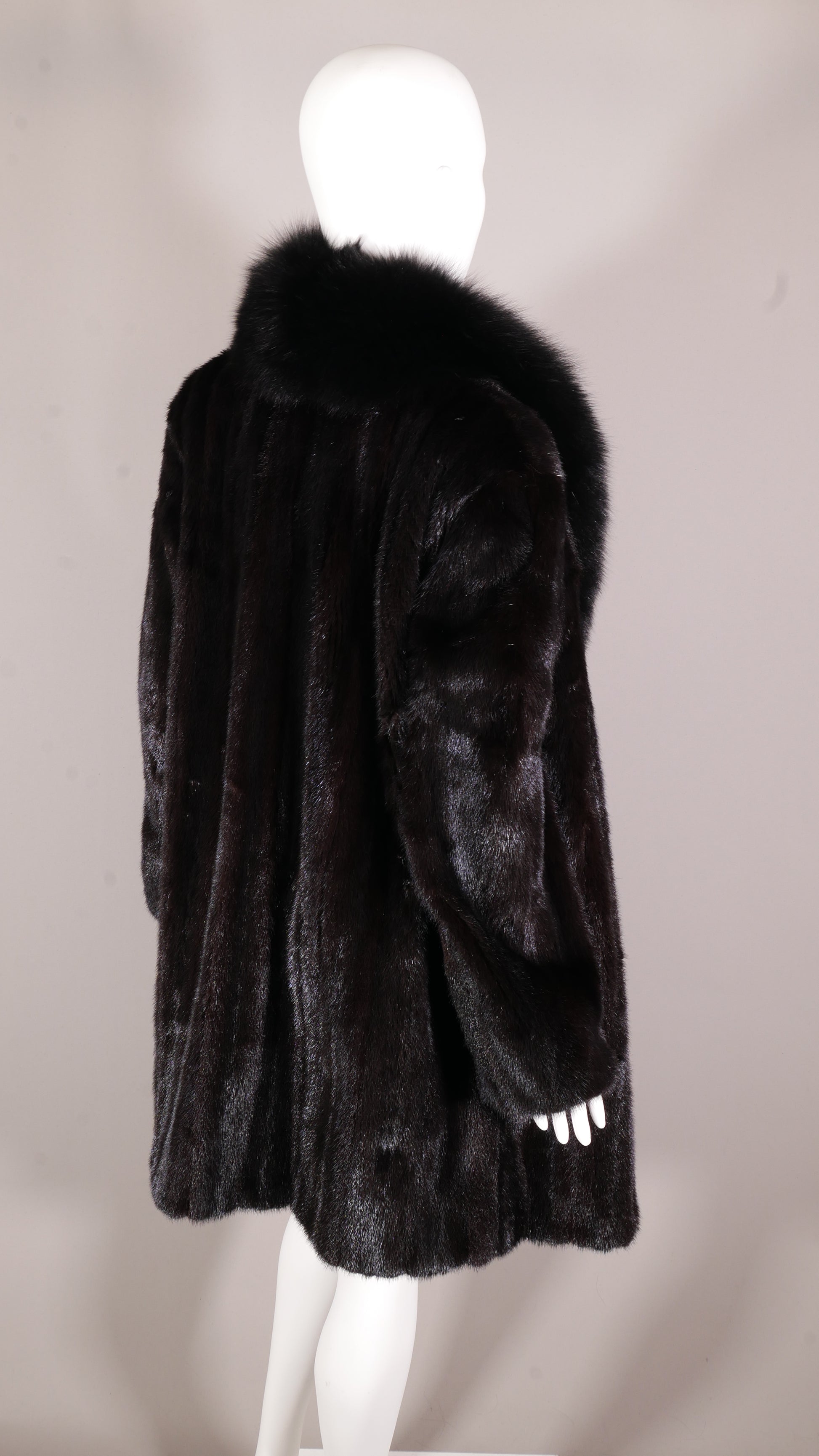 The essential "little black dress" of furs. This USA-origin Ranch Mink stroller is elevated by a dramatic, full-length fox trim collar, combining timeless texture with a modern, composed silhouette.