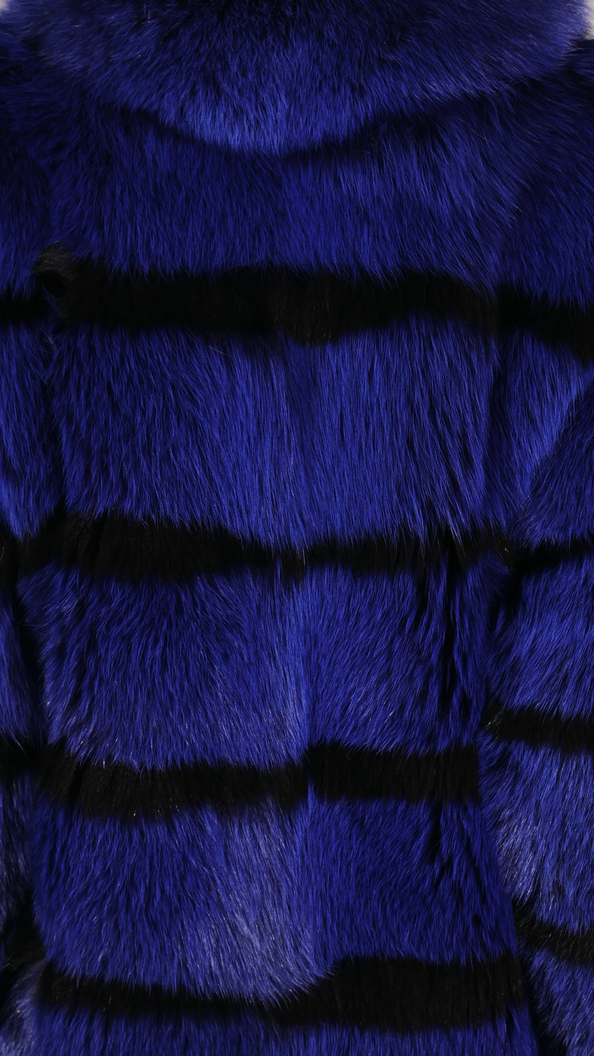 A definitive, full-length coat designed for pure visual impact. Crafted from plush, USA-origin fox, its bold midnight blue and black stripes create a powerful, confident silhouette. Lined with pure silk for a flawless drape.